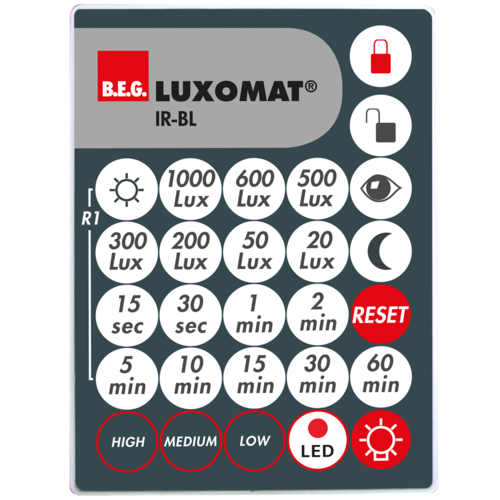 Werkseinstellung: Erfassungsempfindlichkeit High, Nachlaufzeit 10 min, Einschaltschwelle 500 Lux