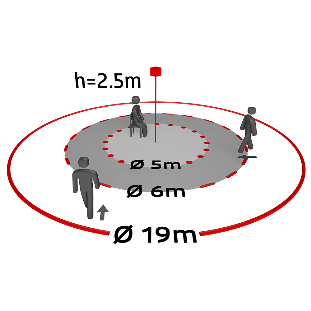 Überwachte Fläche bei tangentialer Bewegung: 280 m² / 2.5 m Montagehöhe