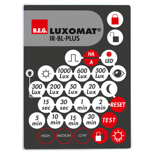 Factory setting: High detection sensitivity, follow-up time 10 min, switch-on threshold 500 lux