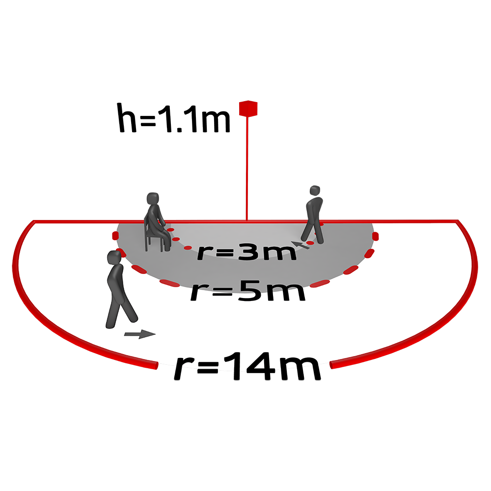 Monitored area (tangential movement): 300 m² / 1.1 m mounting height