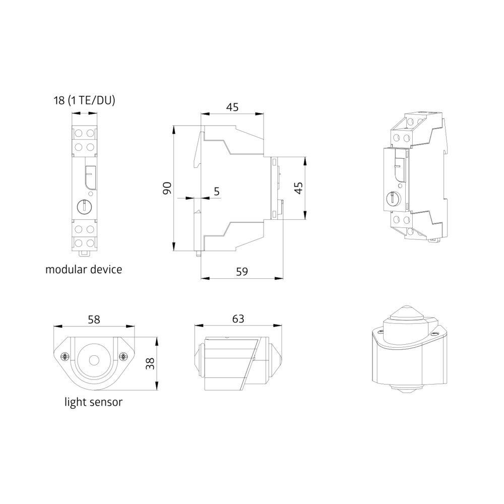• Dimensions: Light sensor: 63 x 38 x 58 mm, DIN-rail mount device 90 x 18 x 45 mm